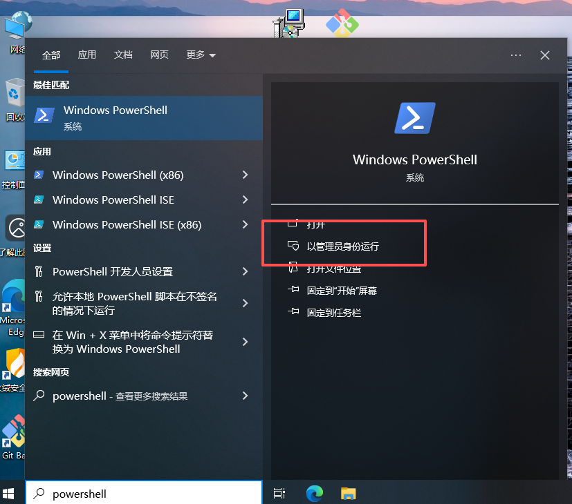 在开始菜单旁边的地方搜 Powershell ,用管理员身份运行