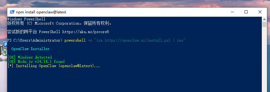 powershell -c "irm https://openclaw.ai/install.ps1 | iex"